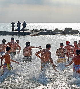Anche a Nettuno, nello stabilimento Belvedere, non sono mancati all?evento appassionati, curiosi e amanti del mare. Qui il tuffo è iniziato a mezzogiorno in punto. Per garantire sicurezza c?erano anche le moto d?acqua della squadra nautica del Commissariato di Anzio e Nettuno. Anche quest?anno il bagno di Capodanno è stato un bello spettacolo: appuntamento al 2009? (Foto: M.T. Barone)