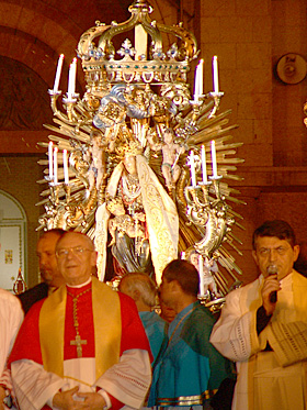 Commuovente come sempre il momento in cui la statua di Nostra Signora, portata in spalla dai membri della Confraternita di San Giovanni, si è fermata a piazza Cesare Battisti, davanti all?entrata del borgo medioevale, dove è stata acclamata dai tantissimi fedeli, a migliaia, scesi in piazza per la loro patrona. Al grido di ?Viva Maria? la processione è proseguita per le vie del centro fino a San Giovanni, tra fuochi di artificio, bancarelle stracolme di cittadini, luminarie abbaglianti e una marea di fedeli.