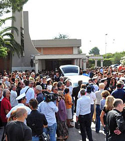 Distrutti i genitori della ragazza, che durante i funerali ha gridato ?Hanno ucciso i miei due angeli?. La ragazza è stata seppellita con l?abito da sposa, mentre la nonna ha accolto le tante persone che hanno fatto visita per condividere il dolore della scomparsa donando i confetti che erano stati preparati per la cerimonia. A recitare l?omelia Padre Francesco, che ha detto che l?amore deve essere più forte della morte e può sconfiggere il dolore. (Foto: Mino Ippoliti)