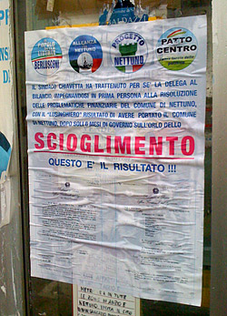 Pdl, Alleanza per Nettuno, Progetto Nettuno affiancati dalla sigla del Patto di Centro hanno firmato un manifesto nel quale dichiarano che il comune di Nettuno si trova sull?orlo del fallimento dopo solo sei mesi dalle elezioni. L?accusa al primo cittadino Alessio Chiavetta è quella di aver ?ha tenuto per sé la delega al bilancio, impegnandosi in prima persona alla risoluzione delle problematiche finanziare del comune di Nettuno, con il lusinghiero risultato di aver portato il Comune, dopo solo sei mesi, sull?orlo dello scioglimento?. Per confermare queste dichiarazioni i gruppi firmatari presenti in Consiglio hanno riportato una copia della lettera del Prefetto Carlo Mosca nella quale, lo scorso 20 ottobre, intimava al comune di Nettuno e ad altri otto comuni della provincia di Roma, di approvare la delibera di salvaguardia degli equilibri di bilancio entro venti giorni dal ricevimento della nota. Per Nettuno questo vuol dire che i riequilibri di bilancio dovranno essere portati in Consiglio ed approvati entro il 10 novembre, pena, da quanto scritto dal Prefetto ?l?intervento sostitutivo con la nomina del commissario ad acta e con conseguente inizio della procedura di scioglimento?. La critica molto dura del centrodestra riguarda proprio il mancato rispetto dei termini per approvare gli equilibri che scadevano lo scorso 30 settembre e ?ridursi all?ultimo momento ? continuano ? a portare in consiglio gli equilibri di bilancio significa quantomeno scarsa attenzione; quando la maggioranza è stata chiamata a governare la città, sapeva che tra le priorità da affrontare figurava proprio il bilancio comunale; solo una settimana fa hanno giustificato questo ritardo con l?impossibilità di fare chiarezza sul bilancio; dopo sei mesi di governo per noi è una giustificazione inaccettabile che conferma le difficoltà con le quali si sta muovendo questa amministrazione?.