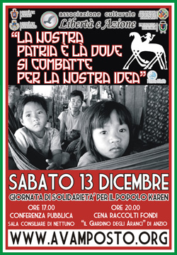 Ha organizzato una giornata di solidarietà per il popolo Karen, l?associazione culturale ?Libertà e Azione?, con il patrocinio del comune di Anzio, del comune di Nettuno, della Provincia di Roma e della Regione Lazio. La giornata si svolgerà prima all?interno della Sala Consiliare del comune di Nettuno, dove, alle 17, si terrà una conferenza sulle problematiche relative a questo popolo birmano, che dal 1949 lotta contro il governo centrale di Rangoon per ottenere l?indipendenza e preservare la sua identità. Come molte altre etnie, anche i Karen, sono vittime di questa guerra civile. A parlare di questa situazione, quindi, Davide Ciotola, responsabile alle Attività Socio-Culturali di ?Libertà e Azione?, Rodolfo Turano, consigliere comunale e medico volontario della ?Comunità Popoli?, Franco Nerozzi, presidente della ?Comunità Popoli Onlus?, Fabio Franceschini, presidente de ?L'uomo Libero Onlus? ed, infine, Marco Cochi, giornalista esperto di geopolitica e sicurezza internazionale. Alle 20 il ristorante ?Il Giardino Degli Aranci ? di via Ardeatina ad Anzio, ospiterà la cena di raccolta fondi per la ?Comunità Popoli?, con una quota solciale di 30 euro. Per ottenere maggiori informazioni è possibile visitare il sito www.avamposto.org, mandare una mail a libertaeazione@avamposto.org o contatatre il numero 338/6146460.