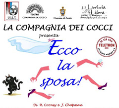 Nuovo appuntamento benefico per la Compagnia dei Cocci, che torna in scena con "Ecco la sposa" questo sabato 10 gennaio al teatro Cafaro di Latina. Il ricavato della serata, organizzata con il patrocinio del comune di Latina, andrà a favore della Lega Italiana Fibrosi Cistica Associazione laziale Onlus. Per assistere allo spettacolo i biglietti possono essere acuistati direttamente al botteghino del teatro con un'offerta libera, purchè non sia inferiore ai 10 euro. La commedia che la Compagnia dei Cocci ripropone a Latina, scritta da Ray Cooney e John Chapman, ha riscosso grande successo sia nel teatro di Villa Adele e che nelle due serate che si sono tenute al Forte Sangallo. la collaborazione del gruppo teatrale con la Lega italiana fibrosi cistica è stata già, in passato, proficua con la raccolta fondi avviata sempre al curaro di Latina, con lo spettacolo Non ti conosco più. La Lega, ha quindi, proposto alla Compagnia dei Cocci di realizzare un nuovo appuntamento nella città pontina. La storia di 'Ecco la sposa', narra dei preparativi del matrimonio di Judy Westerby, che saranno disturbati dalla "presenza" di Polly Perkins, una avvenente giovane ragazza che solamente Timothy Westerby, il padre della futura sposa, riesce a vedere a causa di un colpo in testa ricevuto durante la giornata. Problemi, equivoci e una buona dose di pazzia saranno al centro della commedia, che riuscirà a far sorridere il pubblico fin dalle prime scene, mantenendolo incollato alle poltrone fino alla sorpresa della scena finale.
