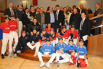 Sulle note della storica colonna sonora di "Momenti di gloria", al seguito di Gianpiero Faraone nuovo coach, ha fatto ingresso tutto il nuovo roster della Danesi Nettuno, questo pomeriggio, alle 18,30, nella Sala Consiliare del comune di Nettuno. Per la prima volta, la squadra di baseball al vertice della Franchigia nettunese è stata presentata ufficialmente in una conferenza stampa, aperta anche a tutti i tifosi. In sala le rappresentanze del settore giovanile della città che, lo scorso anno, hanno riportato a casa ben tre titoli di campioni d'Italia. Durante la conferenza sono stati ufficialmente vestiti i nuovi giocatori e Gianni Capobianco, nettunese doc, ha consegnato alla squadra l'inno "La stella del baseball", da lui composto. Il primo appuntamento con il Nettuno Baseball è per il 31 marzo, alle 18, allo stadio Steno Borghese contro i tedeschi del Regensburg per la coppa campioni e il 10 aprile contro il Godo per la prima giornata di campionato. (Foto: Avvisati)