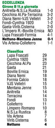 CALCIO. Nettuno-Mentana Jenne si decide dagli 11 metri e lascia l?amaro in bocca ai ragazzi di mister Aldo Panicci. I verdeazzurri cadono ancora in casa condannati da un rigore (dubbio) conquistato e trasformato dal ciociaro Fraternali al 37? del primo tempo. Subito in campo dall?inizio il nuovo acquisto Andrea Crapisto che ha deliziato la platea con ottime giocate senza però riuscire a trovare la via del gol. Le migliori due occasioni per i nettunesi le hanno create Minotti nell?avvio di gara (destro alto dai trenta metri) e Ottolini a pochi minuti dal termine (sinistro in area sulle gambe del portiere avversario).