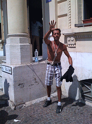 Al posto delle catene, in realtà, il giovane ha scelto una corda legata come cappio al collo: a torso nudo, legato, il giovane è rimasto per svariate ore sul lungomare Matteotti, proprio all'entrata centrale del Municipio, dove ha gridato la sua disperazione nel chiedere al Comune e al Sindaco un posto di lavoro.