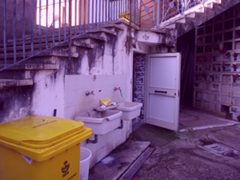 All'ingresso della parte vecchia lo scenario non é dei migliori, un pò come entrare agli scavi di Pompei con antiche colonne lasciate a metà, pezzi di muro crollato, storie e lapidi dimenticate. Inquietudine che prosegue camminando e scorgendo la sporcizia che si trova nei vicoli nascosti, con botole dell'elettricità aperte, cavi scoperti, vasi rotti forse dal vento e dall'incuria. Poi alcuni punti sono addirittura "off limits": il nastro biano e rosso delimita il pericolo tra gli alberi di libeccio e le lapidi, tra i secchioni e le scale, fino ai soppalchi superiori quasi cadenti. I lavori sono visibilmente in corso con gli operai all'opera, viste anche le ultime novità circa il finanziamento di 22mila euro per il nuovo ingresso del cimitero. Ma il lavoro da fare é ancora tanto. Innanzitutto riacquistare la civiltà di questo cimitero che la civiltà sembra averla persa. In passato i disagi per i ladri nel cimitero e la mancanza di scale per disabili e anziani impossibilitati a portare un fiore ai propri cari, oggi la sporcizia ovunque, a partire dal bagno del cimitero il cui degrado é impossibile non notare: porta aperta, serratura rotta, muro imbrattato, tutto putrido e arrugginito. Intorno i lavandini per il cambio dell'acqua anch'essi arrugginiti, sporchi, dimenticati.
