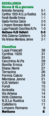 CALCIO. Il Nettuno strappa un pari con la Vjs Velletri, ma resta inesorabilmente ultimo a quota 8 nella classifica del girone B di Eccellenza. I ragazzi di mister Aldo Panicci non riescono ad esprimersi nel migliore dei modi pur rendendosi pericolosi e sfiorando il vantaggio in un paio di occasioni. Gara non certo ricca di emozioni: l?unica occasione degna di nota nel primo tempo nettunese è il colpo di testa di Alessio Panicci che schiaccia bene sul secondo palo vedendosi negare il gol dal numero uno veliterno Pepe. Nella ripresa gi ospiti sfiorano il vantaggio con Grasso su calcio di punizione; risponde il Nettuno con un?azione di Scagnetti messo giù in area (chiesto invano il rigore) e con quella più clamorosa di Belli che da due passi spedisce incredibilmente fuori. Nettuno ancora condizionato dagli infiniti problemi extra calcistici: è previsto in settimana un incontro tra i vertici societari per definire in via definitiva i ruoli dirigenziali e far luce sul futuro della squadra.