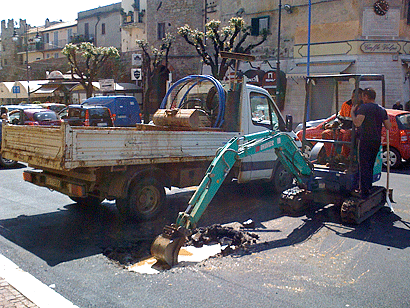 Questa mattina, al centro di Piazza Mazzini, i tecnici si sono accorti di una vistosa perdita d'acqua; probabilmente, durante il lavoro di asfaltatura, ieri era stata lesionata una tubatura dell'acqua, da qui l'urgenza di rimettere nuovamente mano sul manto, scavando una grande buca per ripristinare il danno.