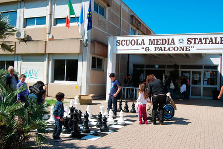 L?evento, organizzato dall?associazione scacchistica ?Quattro Torri? in collaborazione con l?associazione ?Paulus Antiche Arti e Mestieri?, è stato promosso dalla Federazione Scacchistica Italiana e dalla scuola ?Giovanni Falcone? per educare al rispetto delle leggi e delle regole civili. Questo il motto ispiratore della manifestazione sullo sfondo di una grande e affascinante scacchiera con pezzi giganti firmata "Paulus che ha dato spettacolo sotto le palme nel giardino della scuola.