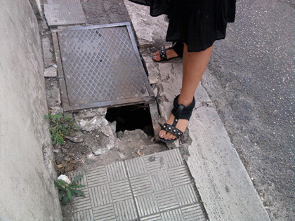 Facile per chiunque inciampare nella buca visto che nella piccola stradina è pericoloso anche sporgersi in strada dove c'è un intenso traffico quotidiano. Come a dire, se si evita la buca si rischia di essere investiti.
