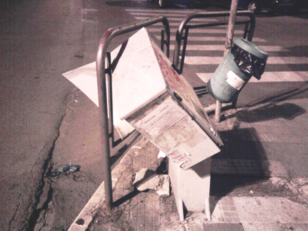 Ecco l'ultima immagine che ritrae Piazzale 9 Settembre 1943, meglio conosciuto come il piazzale della stazione ferroviaria nettunese. Una cabina elettrica è stata infatti presa di mira forse da qualche gruppo di ragazzi annoiati che si sono accaniti fino a distruggerla spaccandola a metà. Uno scempio ma anche un rischio per chiunque si trovi a toccare la cabina con il pericolo di prendere la corrente per qualche filo ancora attivo. Il tutto si aggiunge alla situazione limite che già persiste: marciapiedi e strada distrutti dalle radici dei pini ormai salite fino al manto d'asfalto, pali della segnaletica cadenti, l'unico piccolo secchio dell'immondizia che sta per cedere anch'esso insieme alla ringhiera del marciapiedi.