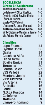 CALCIO. Grande prova del Nettuno che blocca sulla 0-0 il Cecchina arrivato al ?Masin? da terzo della classe. I ragazzi di mister Panicci - tra l?altro in formazione rimaneggiata per le assenze di Scagnetti, Pietrangeli e Ottolini - danno vita ad un match attento e ordinato non subendo praticamente mai l?iniziativa degli avversari. Non solo: a conti fatti il pareggio può anche andar stretto ai verdeazzurri considerando le clamorose occasioni conquistate nel finale: all? 85? Sandi si rende pericolosissimo con un colpo di testa sugli sviluppi di un calcio d?angolo (miracolo del portiere del Cecchina Muscedere); cinque minuti dopo tocca a Malpieri con un destro al volo mettere i brividi agli ospiti, con la palla che rimbalza incredibilmente sul palo, poi sbatte sulla schiena del portiere ed infine si ferma a pochi centimentri dalla linea di porta. Insomma, un passo in avanti per la formazione nettunese, magari anche galvanizzata dal ?nuovo? presidente Fulvio Masin, subentrato definitivamente ad Amedeo Mazzanti (che era tornato nel consiglio direttivo dopo l?addio dello staff viterbese). Il Nettuno sale a 9 punti, resta ultimo in classifica, ma può guardare finalmente con fiducia al prossimo (durissimo) match del prossimo turno: domenica al ?Masin? arriverà la capolista Lupa Frascati che all?anDataInserimento si impose inesorabilmente per 6-1. Servirà una vera e propria prova di orgoglio.