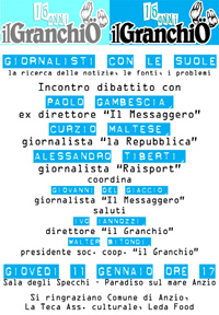 Allora domani, giovedì 11 gennaio, si terrà un convegno al Paradiso sul Mare di Anzio, nella sala degli Specchi alle ore 17.00. Interverranno l?ex direttore del Messaggero Paolo Gambescia, oggi parlamentare dell?Ulivo, Curzio Maltese, editorialista del quotidiano ?La Repubblica?, Alessandro Tiberti, giornalista di Rai Sport. Coordina Giovanni del Giaccio, giornalista del Messaggero. I saluti del direttore del Granchio Ivo Iannozzi, cronista del Messaggero. L?iniziativa è organizzata in collaborazione con il comune di Anzio e l?associazione culturale La Teca.