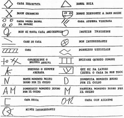 Una Nettuno che soffre: ultimamente per le vie cittadine è stata registrata una notevole presenza di zingari, noti per le loro abitudini di intrufolarsi facilmente in negozi e case. Gli zingari agiscono soprattutto negli orari mattutini, o meglio, in tarda mattinata - dalle 10 alle 12. In campana dunque, specie facendo attenzione ai citofoni e ai muri vicino l'entrata delle abitazioni; se si notano degli strani simboli tracciati con la matita o col pennarello vuol dire che i ladri stanno tenendo sott'occhio le case. I simboli sono la conferma che qualcuno di questa banda di svaligiatori (la maggior parte di origini zingare) sta tenendo sotto controllo alcune case e le abitudini di chi ci abita. I simboli vengono lasciati per ricordarsi delle diverse zone in cui saranno poi compiuti gli atti criminosi. Dopo un lungo lavoro, gli inquirenti, tempo fa, sono riusciti a ricostruire un intero alfabeto zingaro fatto di semplici simboli che oggi riportiamo in foto.