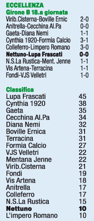 CALCIO. Il Nettuno blocca in casa sullo 0-0 la capolista Lupa Frascati e riceve a fine gara gli applausi scroscianti del suo pubblico. I ragazzi di mister Panicci non solo hanno tenuto testa al ?ciclone? del girone B di Eccellenza (45 punti in 18 gare giocate), ma hanno seriamente rischiato di portare a casa l?intera posta confortati da una buona organizzazione di gioco e da una voglia davvero straordinaria. Al 33? l?episodio chiave della gara: il terzino verdazzurro Lupi tarda nel riconsegnare la palla agli ospiti dopo un fallo, il numero 11 frascatano Gioacchini perde la testa e rifila un calcio all?avversario meritandosi il cartellino rosso. I nettunesi credono nella vittoria e si rendono pericolosissimi nella ripresa: al 32? Scagnetti ? fra i migliori in campo ? conclude da fuori area, il portiere Abruzzese respinge e, sulla ribattuta, si salva con l?aiuto del palo. Al 40? ci prova Panicci, ma la sua conclusione è alta. Due minuti dopo ancora Scagnetti raccoglie di testa un cross dalla bandierina e lo gira sul palo più lontano, ma Abruzzese salva per la seconda vota la baracca. Il Nettuno resta ultimo, ma sale a quota 10 punti e domenica va in casa dell?Impero Romano (stesso punteggio dei verdeazzurri) per dare una svolta alla sua stagione