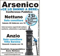 Intanto il prossimo 26 febbraio alle ore 16 i membri del Comitato si incontreranno di nuovo a Nettuno, nella sala consiliare del Comune. L'assemblea pubblica dal titolo "Arsenico, ce lo danno a bere", è finalizzata a chiarire alcuni temi sull'emergenza arsenico nell'acqua, sulla gestione dell'emergenza da parte delle istituzioni e sui referendum sull'acqua pubblica. L'occasione sarà un altro modo per ripresentare le sei domande formulate dal Comitato alle due amministrazioni di Anzio e Nettuno. L'appuntamento ad Anzio ci sarà il 4 marzo, sempre alle ore 16 nella sala consiliare di Villa Sarsina.