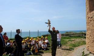 ANZIO, CLASSI IN VISITA A TOR CALDARA. I BAMBINI SALUTANO UN FALCO LIBERATO DAGLI OPERATORI