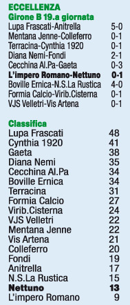 CALCIO. Il Nettuno torna a vincere ed a sperare in una salvezza che appena qualche mese fa sembrava addirittura impensabile. Un acuto a pochi secondi dal novantesimo di capitan Catanzani regala la vittoria, i tre punti e il sorriso ai ragazzi di mister Panicci impegnati in uno spareggio salvezza anticipato sul campo dell?Impero Romano (ex San Filippo Neri Casalotti). Un match importantissimo per i verdeazzurri, un match dominato dal primo all?ultimo minuto di gioco con la porta avversaria che sembrava davvero stregata. La gara si accende quando il centrocampista capitolino Della Libera commette due brutti falli in mezzo al campo meritandosi il rosso. Il Nettuno allora si accende e Alessio Panicci prova qualche minuto dopo ad impensierire il portiere avversario: palla a lato. Allo scadere della prima frazione ci prova Ottolini, ma la mira non è precisa. Nella ripresa stesso filone: verdeazzurri a condurre, Impero costretto nella metà campo. Intorno al 70? Catanzani non finalizza al meglio una ripartenza veloce tirando alto. E ci pensa ancora un super Cannizza a tenere chiusa la porta dei romani per altre due volte. Ma al 90? l?episodio clou: Alessio Panicci batte di corsa un corner, la traiettoria insidiosa inganna l?estremo difensore disturbato dal nettunese Sandi; la palla resta lì proprio dove è arrivato come un falco il capitano verdazzurro Catanzani che di controbalzo la spinge in rete e fa esplodere letteralmente compagni, panchina e tutto lo staff del Nettuno. 0-1: non c?è più tempo per l?Impero Romano per pareggiare i conti. I nettunesi salgono a quota 15 e abbandonano l?ultimo posto della classifica. E domenica un altro scontro diretto con il Colleferro: credere nella salvezza adesso è più che legittimo.