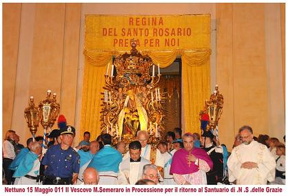 Alle 20,30 la partenza della processione che ha ripercorso le strade dell'anDataInserimento: la Piazza, via Carlo Cattaneo, il lungomare, poi dritti verso il Santuario. In processione tutte le autorità, primo fra tutti il vescovo di Albano Sua Eccellenza Marcello Semeraro il quale non manca, come ogni anno, di presiedere la processione di ritorno. Durante il percorso ancora cieli in festa con lo spettacolo pirotecnico, lo stesso riproposto all'arrivo della statua lignea al Santuario. Qui la vergine - incollata dai confratelli di "Nostra Signora delle Grazie" e quest'anno anche dal confratello-sindaco Alessio Chiavetta - è rimasta qualche minuto, il tempo della predica e della benedizione impartita dal vescovo alla comunità nettunese. A concludere il corteo la schiera di angeli e paggi, le altre confraternite e parrocchie cittadine, le suore, i sacerdoti, i fedeli.