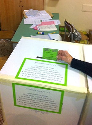 Quattro le schede consegnate nelle urne, rossa, gialla, grigia e verde e la possibilità di esprimere il voto per uno, qualcuno o per tutti i quesiti proposti. Il primo quesito - scheda di colore rosso - prevede l?abrogazione di norme che attualmente consentono di affidare la gestione dei servizi pubblici locali a operatori economici privati. Il secondo quesito - scheda di colore giallo - propone l?abrogazione delle norme che stabiliscono la determinazione della tariffa per l?erogazione dell?acqua, il cui importo prevede attualmente anche la remunerazione del capitale investito dal gestore.