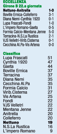 CALCIO. Il Nettuno cala il tris e continua la sua magica striscia di risultati positivi. I ragazzi di Aldo Panicci (sostituito in panchina da Flavio Catanzani a causa della squalifica rimediata una settimana fa a Colleferro) superano in extremis l?Anitrella e tornano prepotentemente alla ribalta per il discorso salvezza. A regalare i tre punti un calcio di punizione a giro del numero 10 Alessio Panicci a tempo abbondantemente scaduto, deviato nella propria porta dal difensore ciociaro Silvestri. ?Questi ragazzi sono eccezionali ? il commento entusiasta del mister che ha assistito dalla tribuna alla gara ? hanno mostrato ancora una volta grande attaccamento alla maglia e alla bandiera nettunese?. I verdeazzurri non avevano disputato una gara brillantissima anche a causa della formazione nettamente rimaneggiata a centrocampo (assenti per squalifica i due centrali titolari Tomassi e Scagnetti), ma si erano comunque resi pericolosi in alcune circostanze con Panicci prima (diagonale a lato) e con Belli poi (tiro ravvicinato respinto). Ma su tutti spicca l?occasione firmata da capitan Franco al 34? del secondo tempo: destro in area diretto nell?angolino alto ben deviato dal portiere Di Girolamo. Gli ospiti avevano risposto con due occasioni nella ripresa entrambi sventate ottimamente dal numero 1 Marinelli miracoloso su due conclusioni ravvicinate. E quando tutti aspettavano il fischio finale (93?) ecco il jolly insidioso di Panicci (tiro cross a giro dal vertice corto destro dell?area di rigore) che la difesa dell?Anitrella spinge in fondo al proprio sacco. I nettunesi ? alla terza vittoria consecutiva ? salgono al terzultimo posto con 19 punti e si portano a sole tre lunghezze dalla salvezza matematica. Niente male per una squadra che in molti già davano per spacciata.