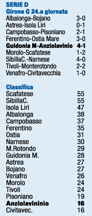 CALCIO. Resta al ?buio? la classifica dell?Anziolavinio che esce pesantemente sconfitto anche dal campo del Guidonia. Un 4-1 che non lascia attenuanti ai ragazzi di mister Solimina che in settimana avevano provato e riprovato sul manto erboso sintetico del Falasche per adattarsi al terreno di gioco dei padroni di casa. Passano pochi secondi dal via e i biancoazzurri sono già sotto: Sabatino ruba palla, entra in area e fredda un incredulo Della Luna. Al 22? il raddoppio: Della Luna stende in area Cipollone, è rigore. Batte Mereu che non sbaglia. Ci pensa Antonelli a riaccendere le speranze anziati al 33?: il bomber si procura e realizza un calcio di punizione dai venti metri sul quale Pagella non può nulla. Ma il primo tempo regala ancora emozioni: il Guidonia non si accontenta e mette a segno anche il 3-1 grazie ad un bel colpo di testa di Borsa ben servito da Mereu. Nella ripresa la musica non cambia: capitan Sabatino, spietato, concede il poker ancora di testa.