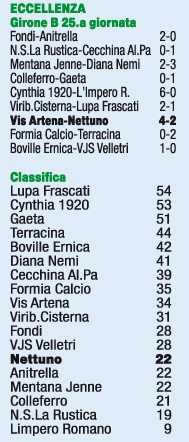 CALCIO. Il Nettuno prepara il match di mercoledì pomeriggio con il Cynthia secondo in classifica (turno infrasettimanale valido per l?ottava giornata di ritorno, inizio ore 15 al ?Masin?) con l?obiettivo di conquistare punti preziosi nella corsa alla salvezza. Servirà un?altra impresa a capitan Catanzani e compagni per tenere a bada una delle formazioni più forti del girone B di Eccellenza. Mister Aldo Panicci confida nei rientri di Sandi e Zamparo e del numero 10 Alessio Panicci tutti e tre assenti nel match di domenica ad Artena. In casa del mister di Anzio Paolo D?Este i verdeblu hanno ceduto l?intera posta ai padroni di casa al termine di una match avvincente e dalle mille emozioni. Al 7? i nettunesi sono già sotto: lo specialista De Angelis calcia una punizione da 40 metri, il giovane portiere Santini non è attento e si fa sorprendere per l?1-0 della Vis Artena. Il pari arriva in avvio di ripresa ed è firmato dal difensore Ostaggio che raccoglie di testa un cross di Tomassi e mette alle spalle di Coriandoli. Ma è qui che in appena 5? l?Artena costruisce la propria vittoria: all?8? uno scatenato Cianni conclude finalizzando al meglio un?azione corale da applausi, al 13? Delle Donne regala dal fondo un assist d?oro allo stesso numero 11 che sottomisura si conferma spietato (3-1). Il Nettuno però non molla mai e riapre il match al 25? con Belli: bel colpo di testa e palla nel sacco per il 3-2. Nel quarto minuto di recupero i padroni di casa trovano il poker grazie ad un altro prezioso assist di Delle Donne sfruttato con un gran diagonale da Palmioli (4-2). Le contemporanee sconfitte delle dirette contendenti non complicano più di tanto il cammino dei verdeblu che restano quartultimi insieme a Mentana Jenne e Anitrella a quota 22 punti.