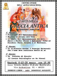 ?I miti dell?antica Grecia? tornano a far sognare, in una conferenza organizzata dal Centro Studi sull?Autoconoscenza (Cea), un?associazione culturale senza fini di lucro che ha come obiettivo lo studio e la rivalorizzazione delle fonti culturali in tema di: antropologia, mitologia, religione, arte, filosofia, psicologia. Per questo nasce l?incontro del prossimo martedì 20 marzo, alle ore 19,00 presso la Scuola Media Statale Unificata in Via Ardeatina 81, che segue gli altri due eventi dello scorso 6 e 13 marzo. L?ingresso è gratuito.