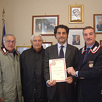 E? stato il brigadiere Arnaldo Albini, presidente della sezione di Anzio dell?Associazione Nazionale dei Carabinieri, accompagnato dai soci Carlo Ceci e Bruno Vittori, a consegnare al sindaco di Anzio, Candido De Angelis l?attestato che proclama l?amministrazione comunale ?Socio Benemerito? dell?Arma.